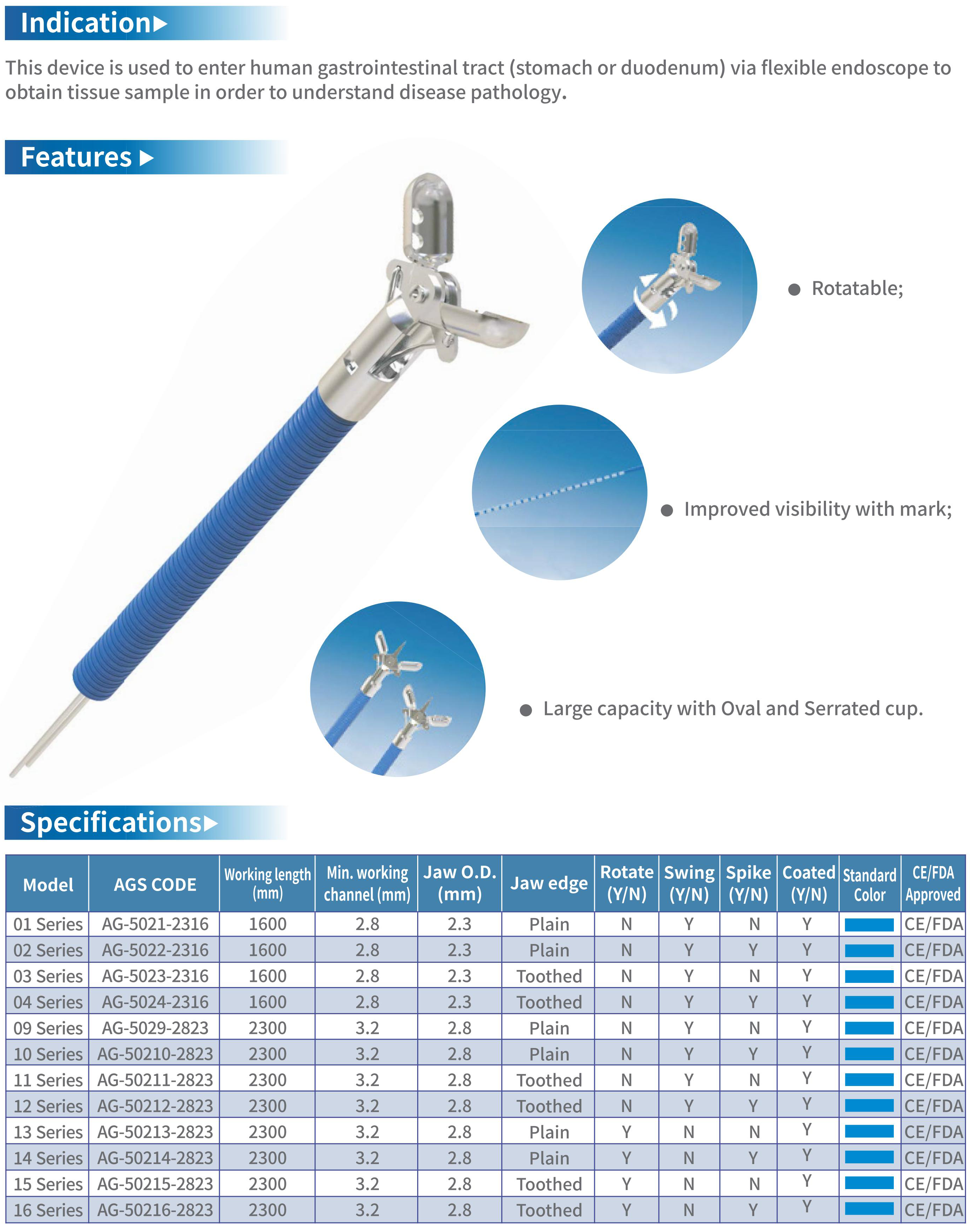 Indication:This device is used to enter human gastrointestinal tract (stomach or duodenum) via flexible endoscope to obtain tissue sample in order to understand disease pathology.